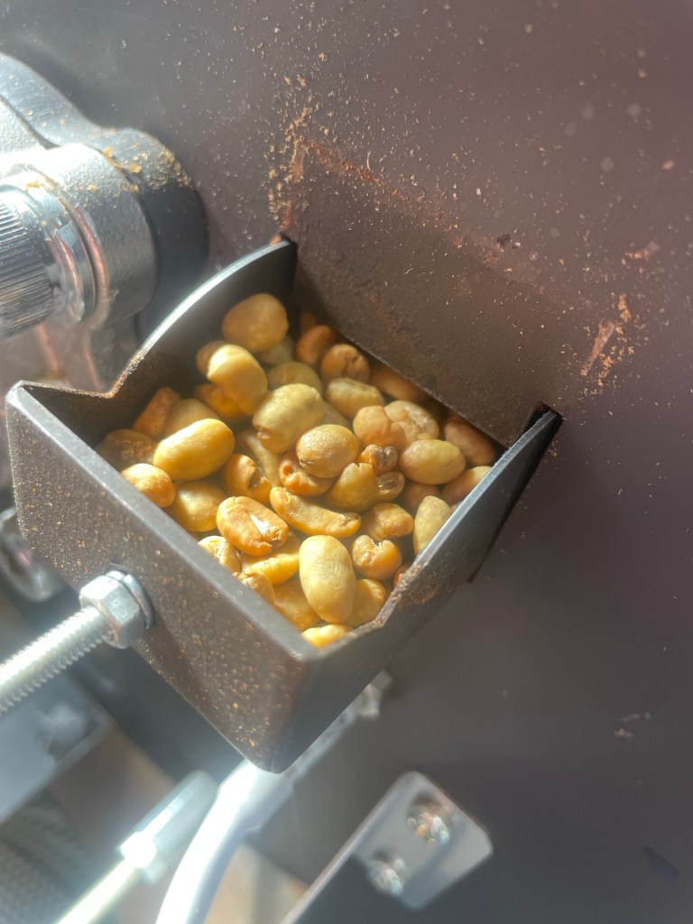 本日3月10日(火)の朝は、心地よい生豆の青い香りから始まり、次第に甘く香ばしい焙煎の香りへと店内が包まれています。ただいま、じっくりと火を入れた「深煎り」のコーヒー豆と、体に優しい「カフェインレス」のコーヒー豆を焙煎しております。