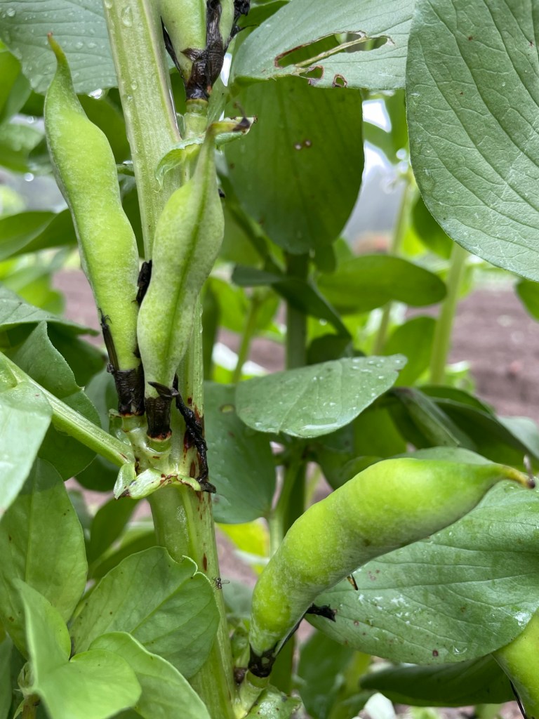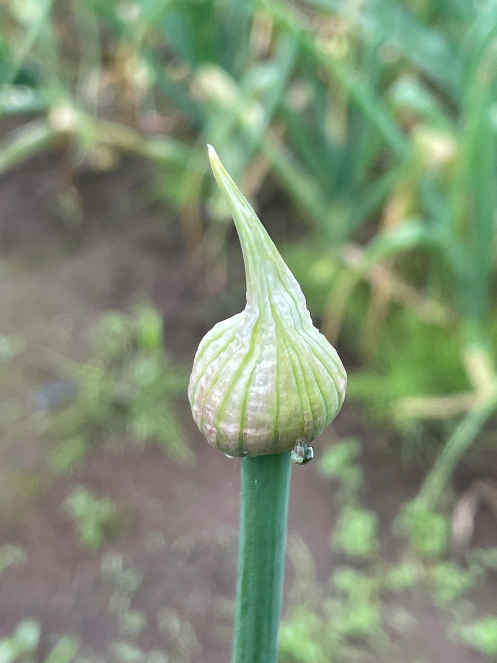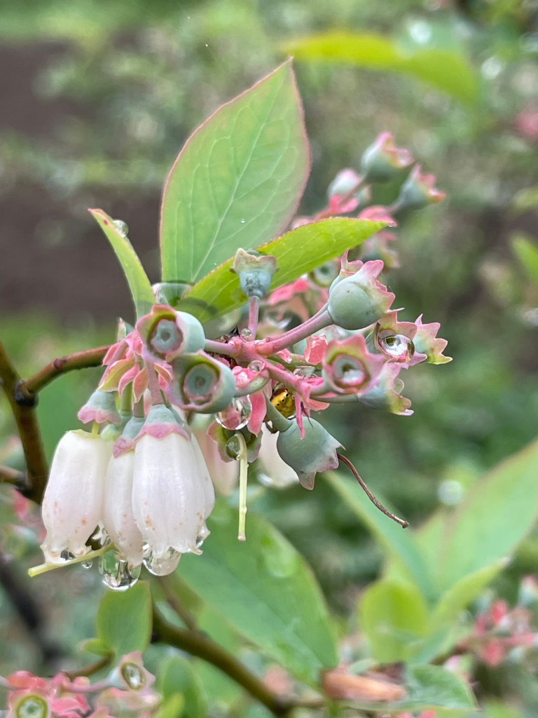 鈴のような可愛らしい花を咲かせたブルーベリー、力強く天を突く玉ねぎの蕾、そして着々と実を太らせるそら豆。